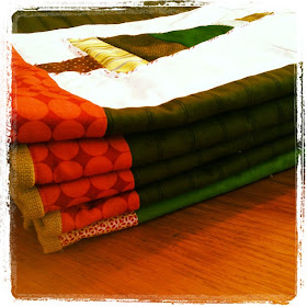 Before Turkey Day I signed up to be apart of Susan and Kersey's "Holiday Gift Swap" I thought it was a great idea and I super way to get some exception handmade gifts crossed off my list. I wasn't sure what I wanted to make but I knew it would involve fabric, quilting and something use-able. The day before I was suppose to send my "gifts" in the mail... I finally settle on an idea: drink coasters and as quick as I had decided I changed my mind again: table runner.